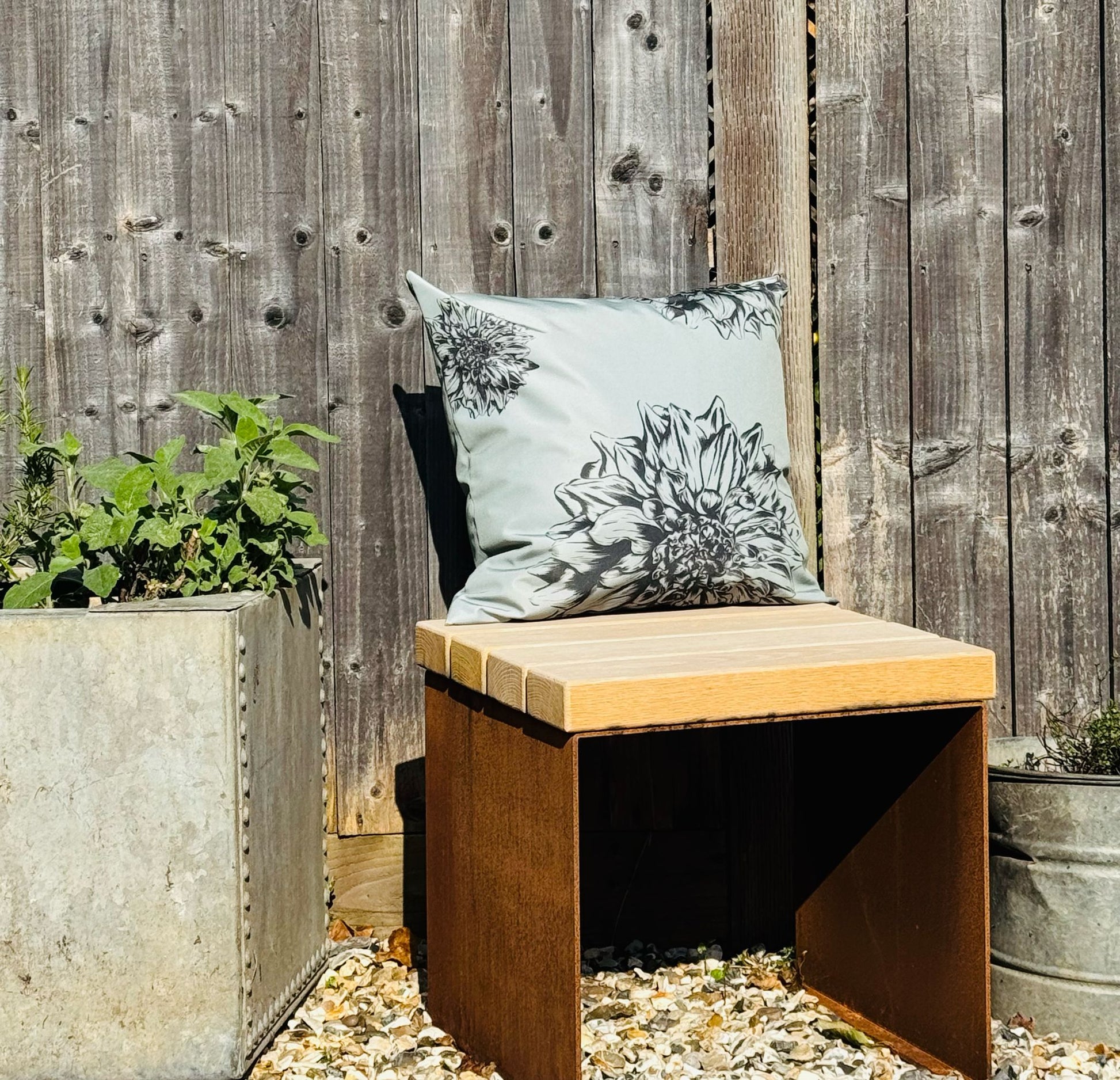 Beautiful Corten steel cube stool with oak slatted top Providing a stylish and functional feature for your outdoor space.