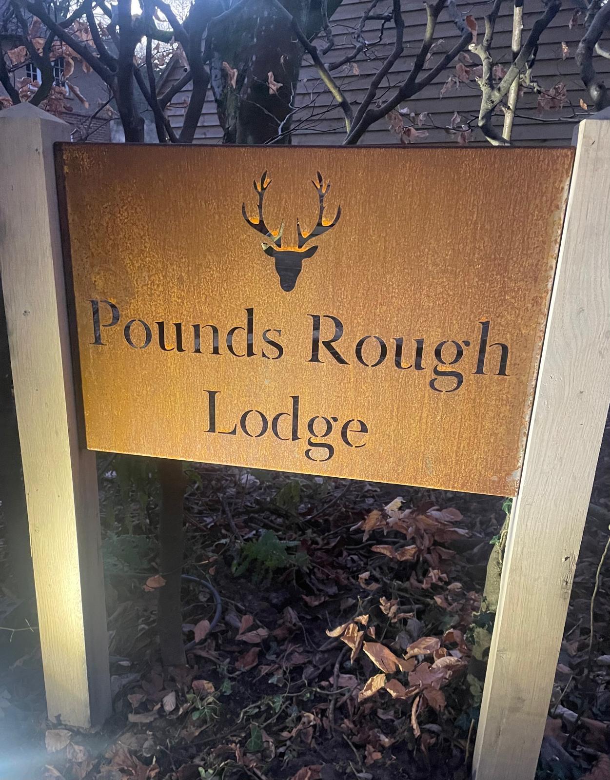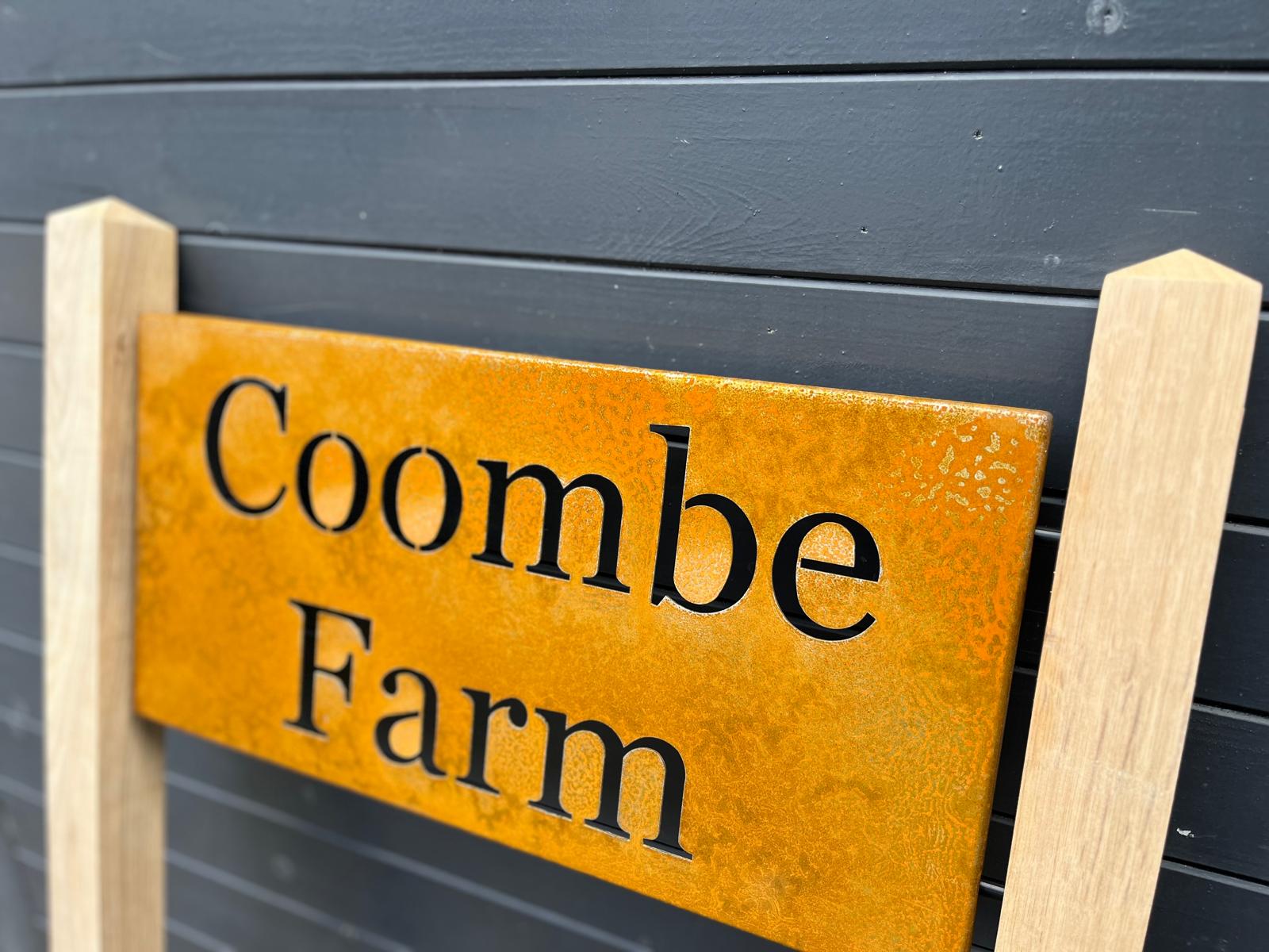 Beautiful Corten steel mounted between oak posts house name / address sign /Company sign. Providing a stylish feature for your front entrance, garden or business.