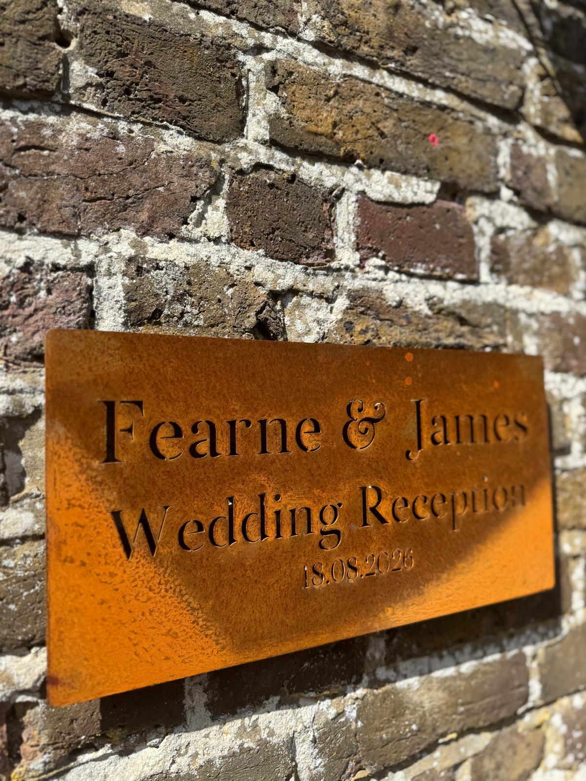 Beautiful Corten steel wall mounted sign to signpost your Wedding guests to either ceremony or reception. Providing a stylish feature for your day and something to treasure as a keepsake!